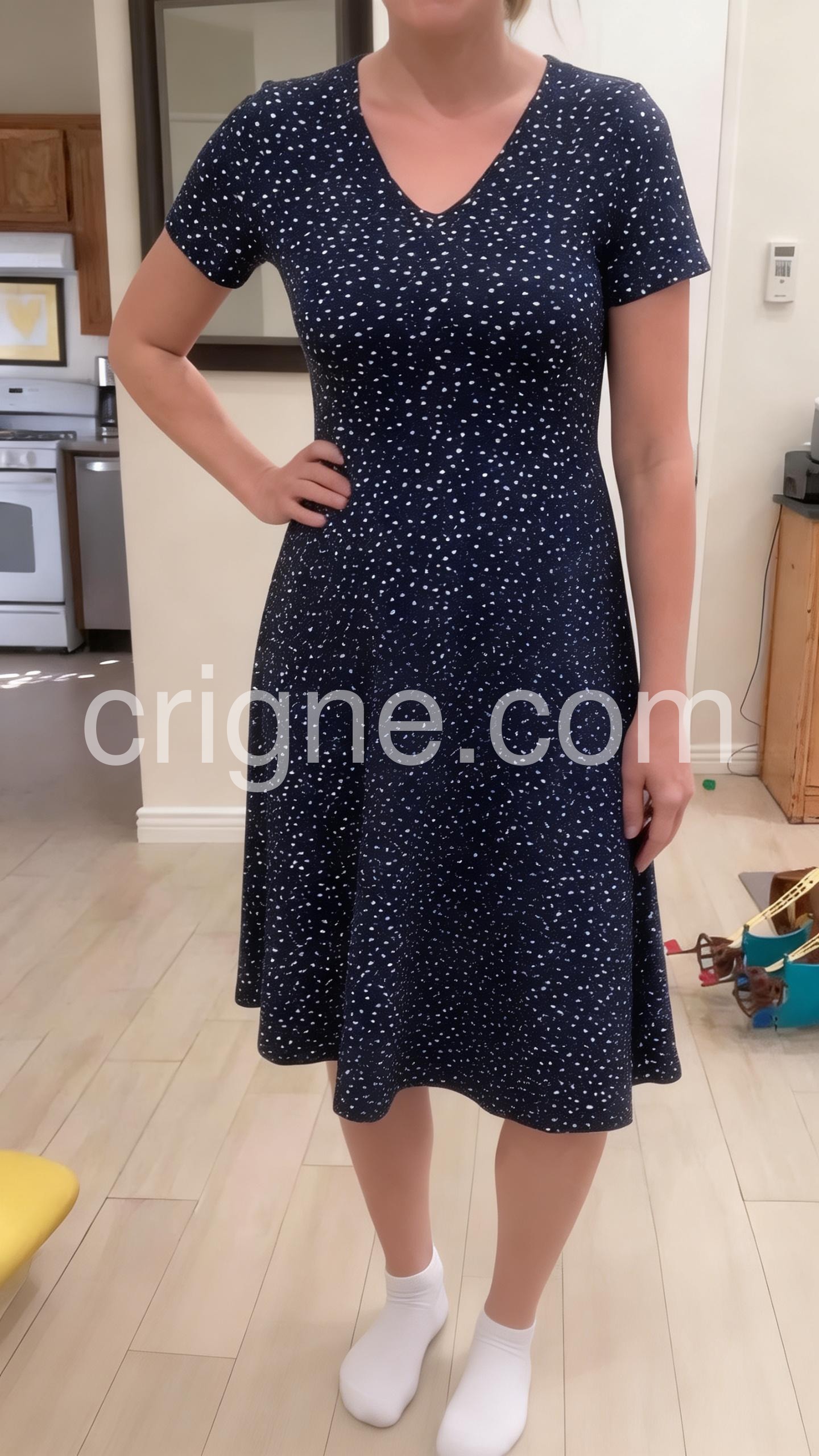 This dress is everything! It is super lightweight and breezy, perfect for hot weather. The V-neck is really elegant and the dark blue is gorgeous.