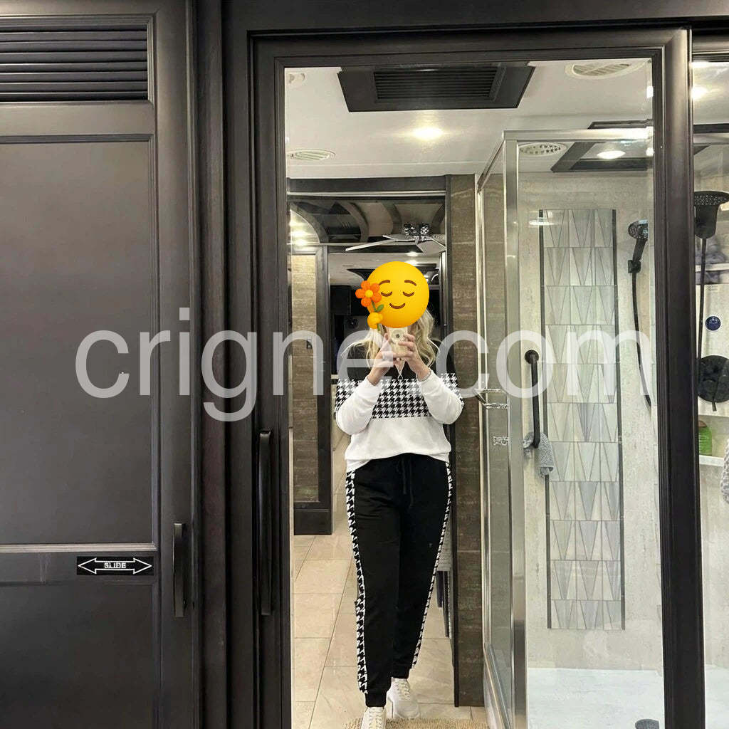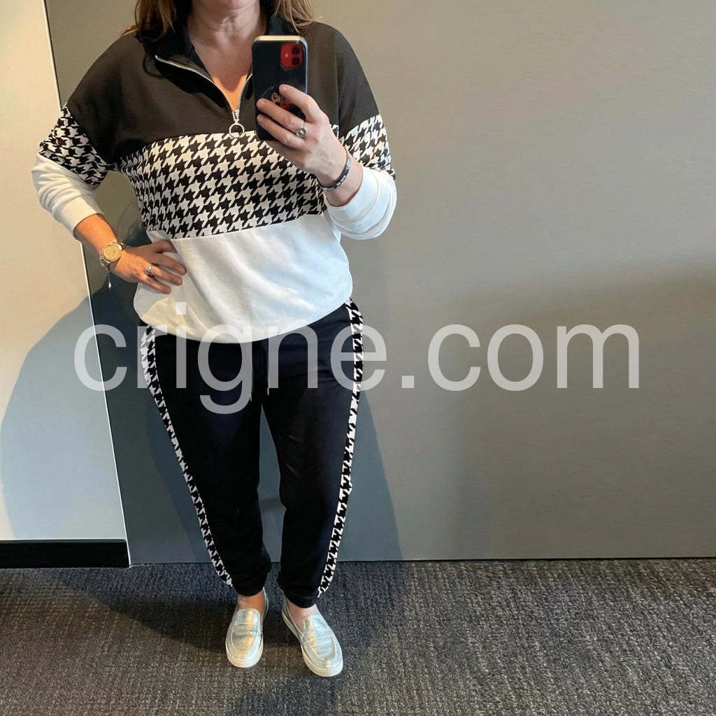 I am absolutely in love with this two-piece set! The houndstooth pattern is super chic and the material is incredibly soft. It is perfect for running errands or just lounging around the house. The zipper detail adds a nice touch.