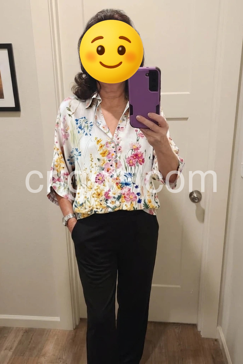 Absolutely love the floral pattern on this top! The colors are so vibrant and perfect for spring. It fits perfectly and feels very lightweight.
