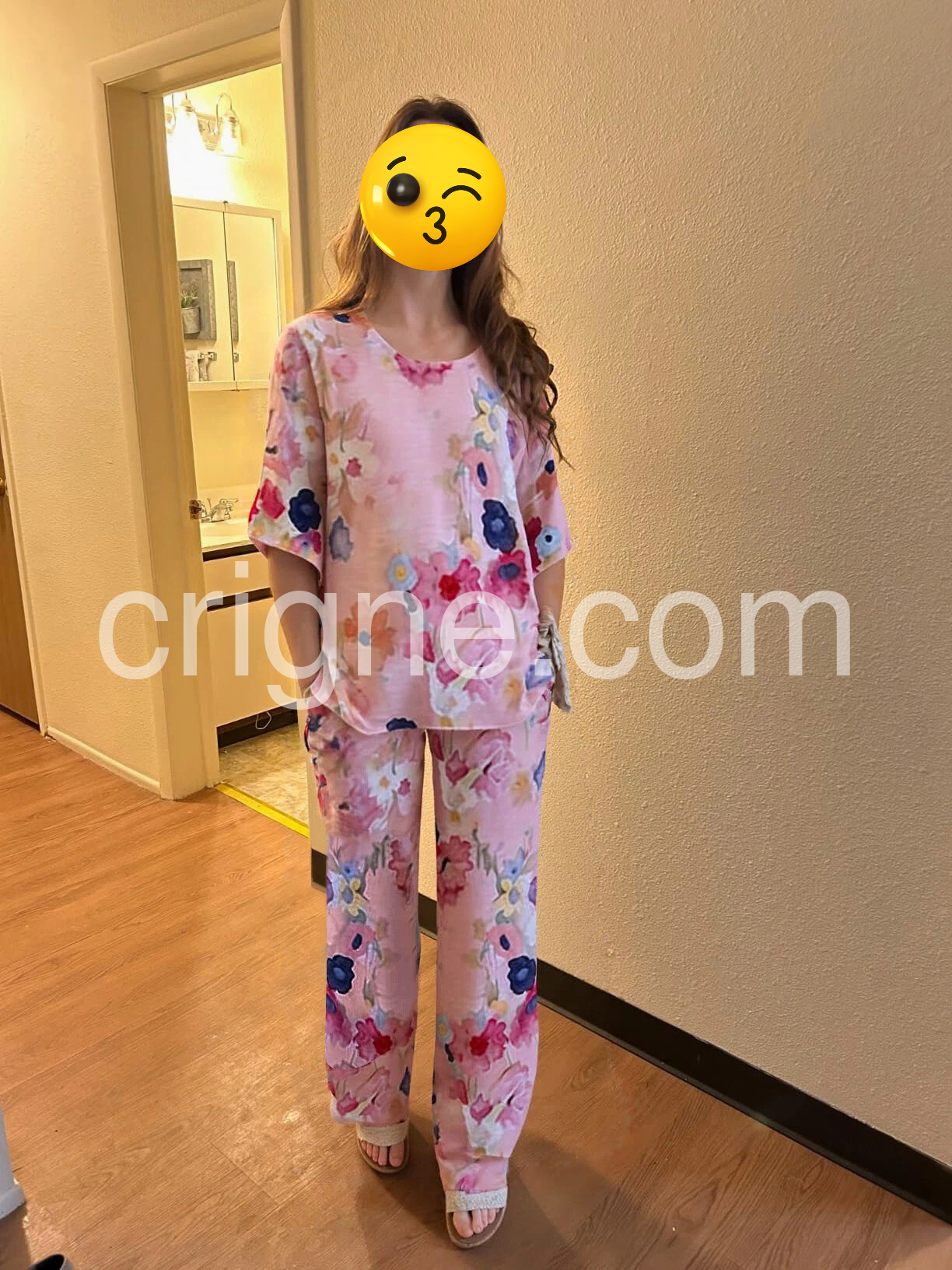 I bought this set for an upcoming cruise and it is absolutely perfect. The material is so lightweight and breathable, making it ideal for tropical weather. The pink floral pattern is vibrant and exactly as pictured. I received so many compliments walking around the ship. Highly recommend!