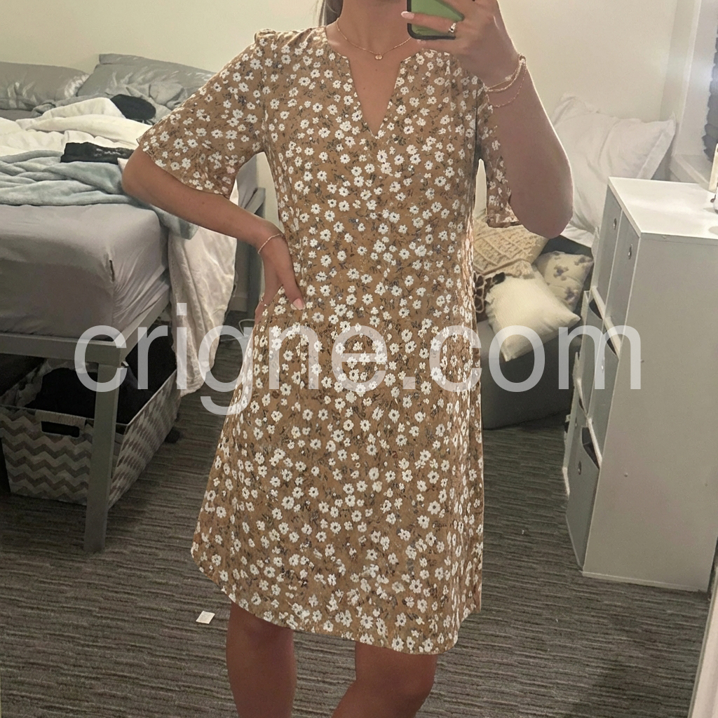 Love this dress! The little white flowers on the tan background are so cute for spring. It fits perfectly and is incredibly comfortable.