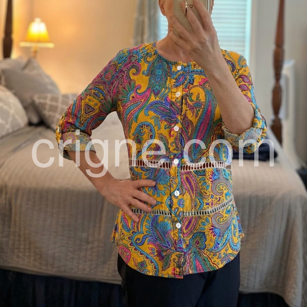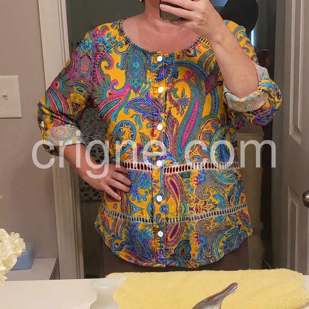 I absolutely love this top! The paisley pattern is so vibrant and beautiful in person. The mustard yellow color really pops. It fits true to size and the length is perfect to wear with leggings or jeans.