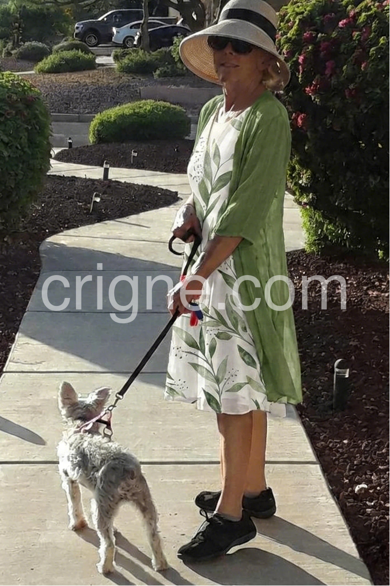 Green Leaf Print Dress Cardigan Two Piece Set