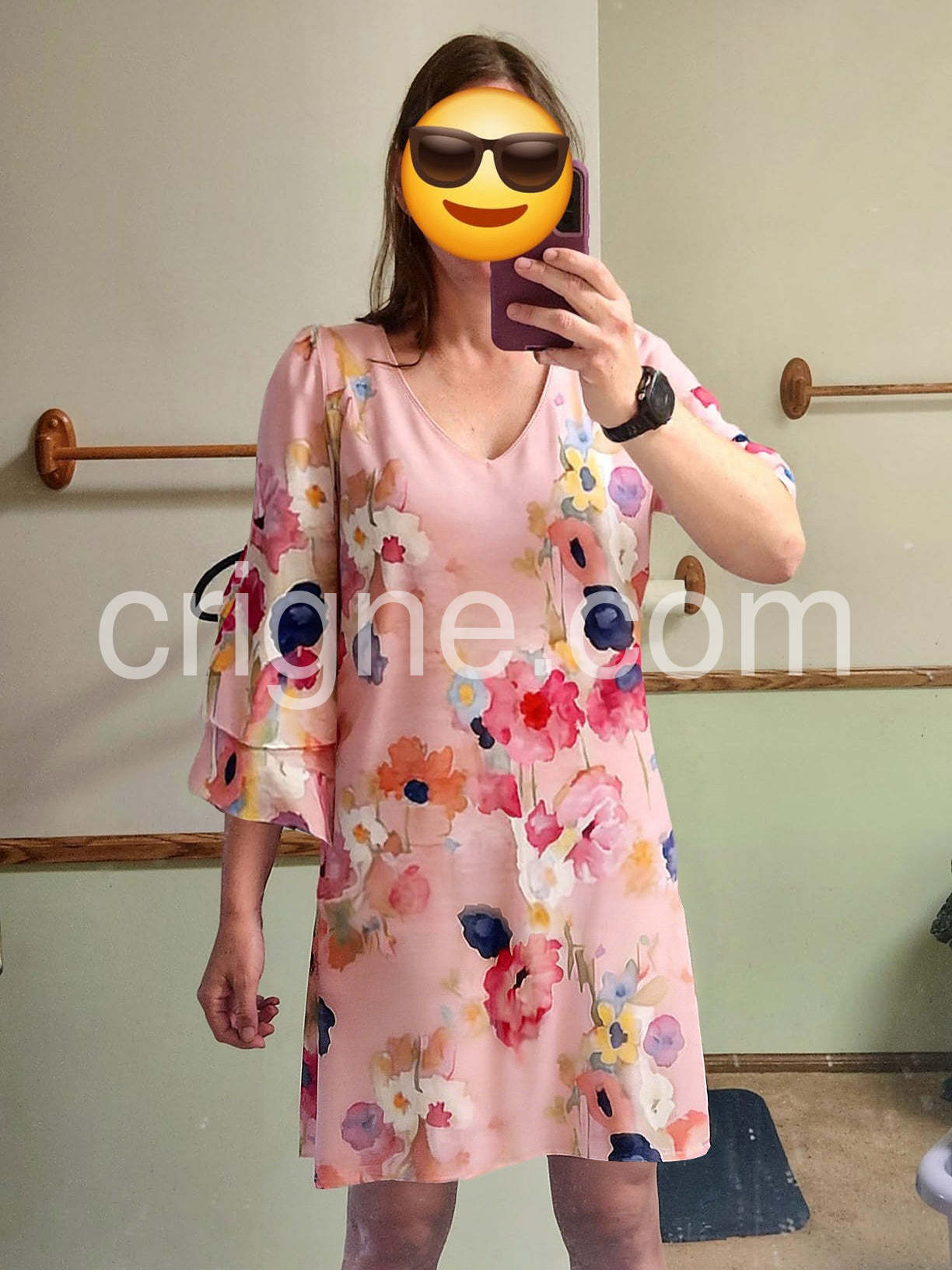 Absolutely love this dress! The watercolor floral pattern is so beautiful in person. The fit is incredibly flattering and forgiving without looking like a tent. Perfect for my upcoming spring vacation.