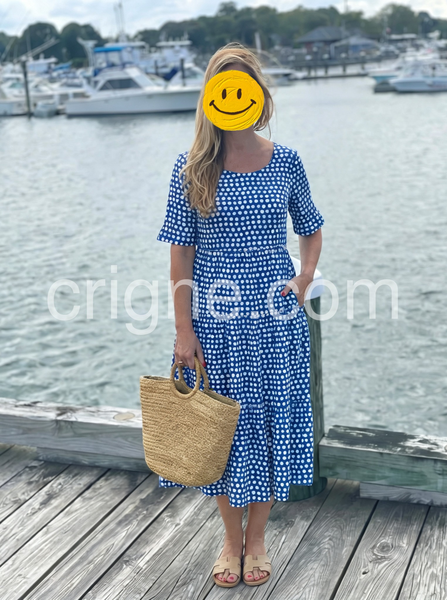Such a fun, retro vibe with the bright blue and white polka dots. The little daisy applique is adorable. Sizing was spot on for my regular size.
