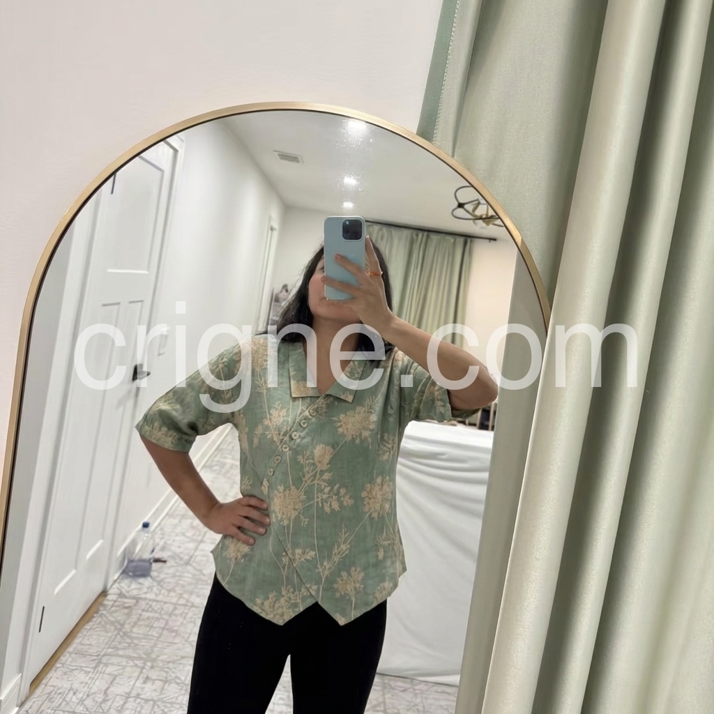 Beautiful spring shirt. The muted green is a lovely earthy tone, and the little flowers give it a vintage boho vibe. The half sleeves are great for transitioning weather. It fits very well and drapes nicely.