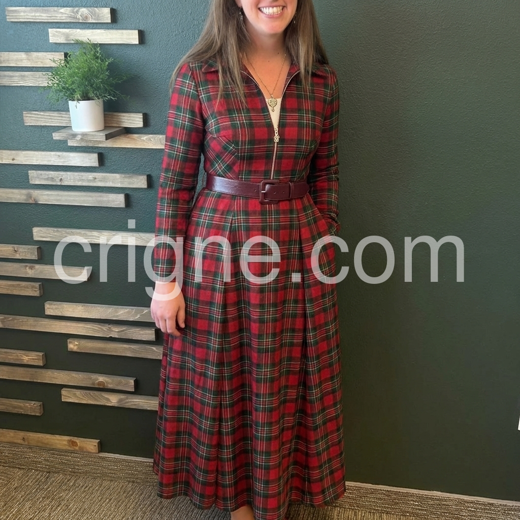 Distinctive Red Plaid Zip Front Long Sleeve Maxi Dress