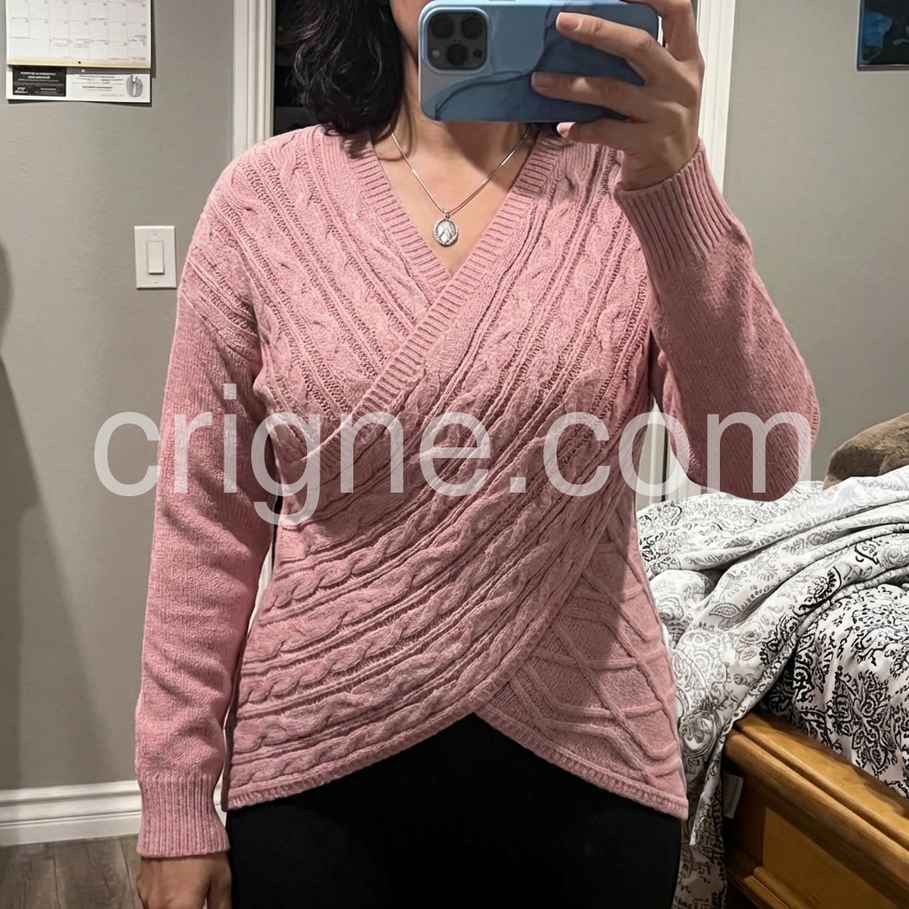 As soon as I saw this sweater, I knew I had to have it. The cross-over front design is unique, and the knit pattern is super charming. It feels comfortable, looks elegant, and works perfectly for everyday wear when I want something warmer and more stylish.