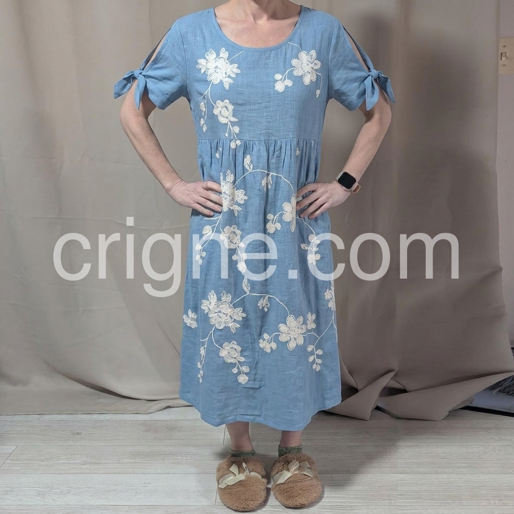 The sleeve ties are such a cute detail! This dress is so flowy and flattering. I carry a bit of extra weight in my midsection, and the loose fit just skims right over it. The fabric feels like a nice linen blend. Perfect for a summer day.