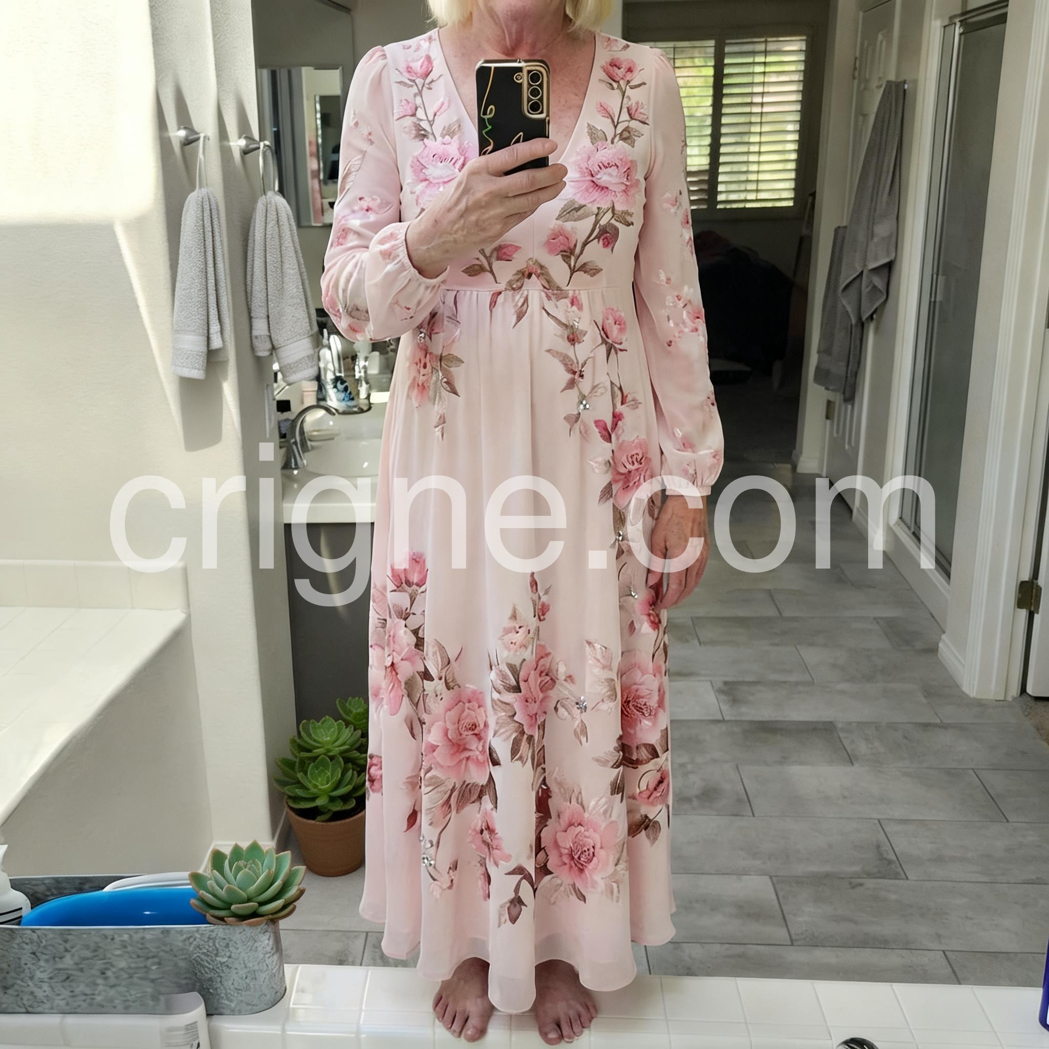 This is exactly what I was looking for. The length is a true maxi on me and the floral design is breathtaking. The pale pink background makes the darker pink flowers pop. Excellent purchase.