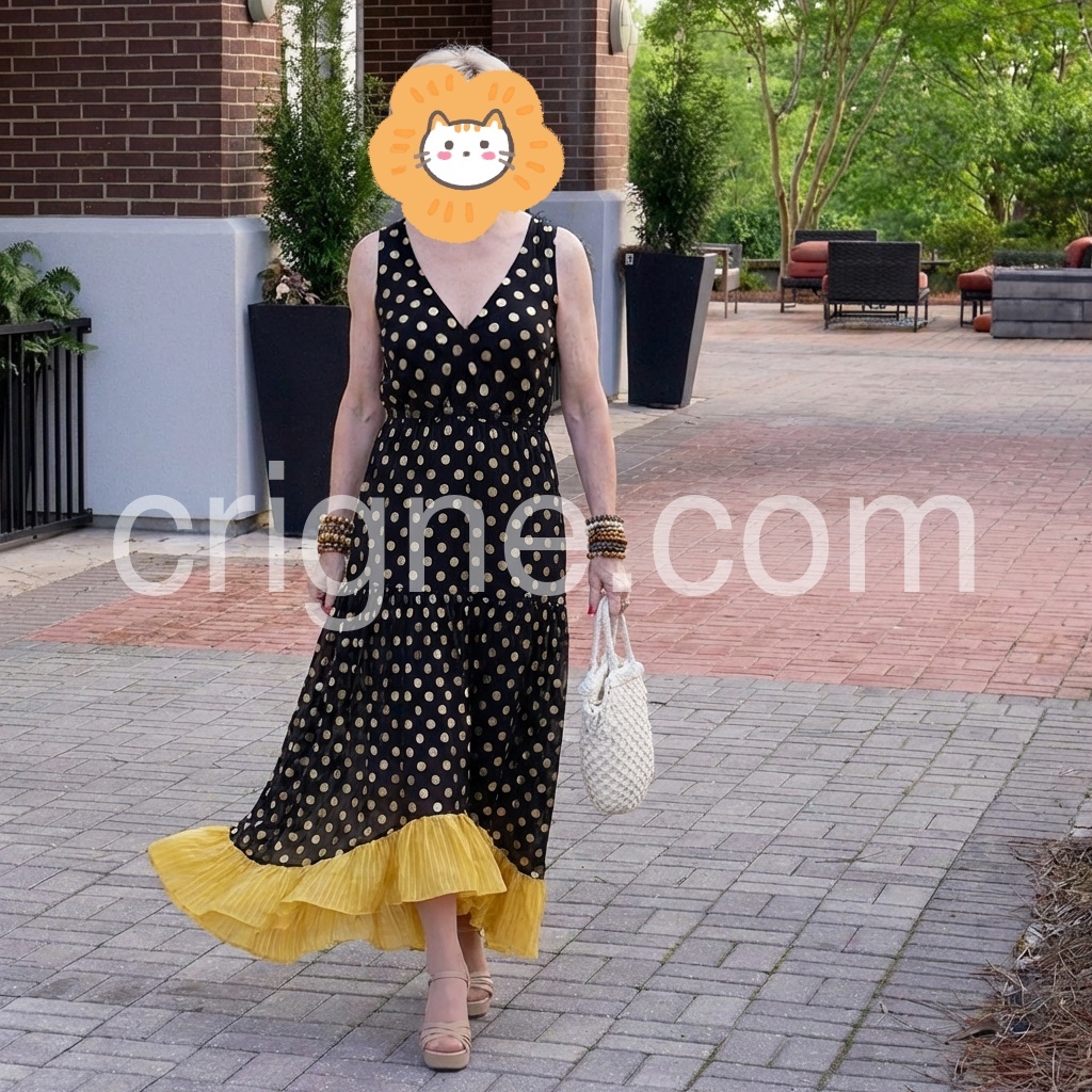 What a stunning dress! The contrast between the black and white dots and the bright yellow hem is striking. It is very well made, all the seams are finished nicely and there are no loose threads. It has a very relaxed boho vibe but still looks put-together. Perfect for a cruise or tropical getaway.