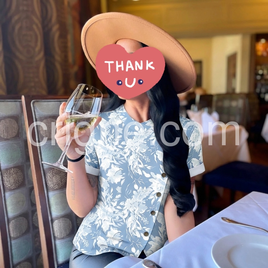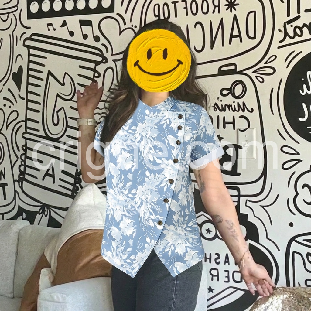 Love the light blue color and the white floral print. The diagonal buttons give it such a unique touch!