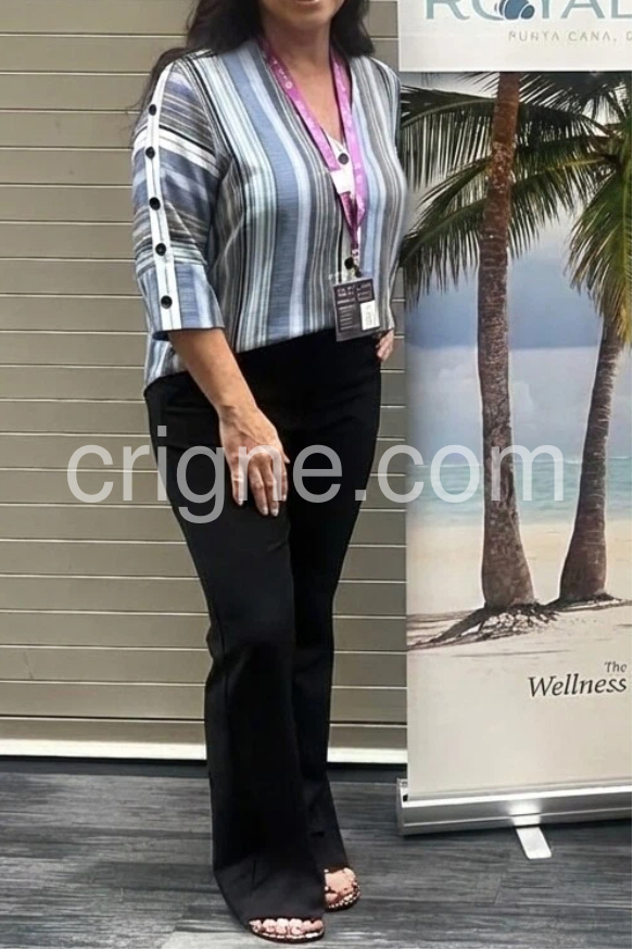 I absolutely love this striped blouse! The blue and grey tones are so pretty and versatile. The v-neck is flattering without being too deep, and it looks great with my favorite pair of jeans. The button details on the sleeves give it an extra touch of style. Highly recommend!