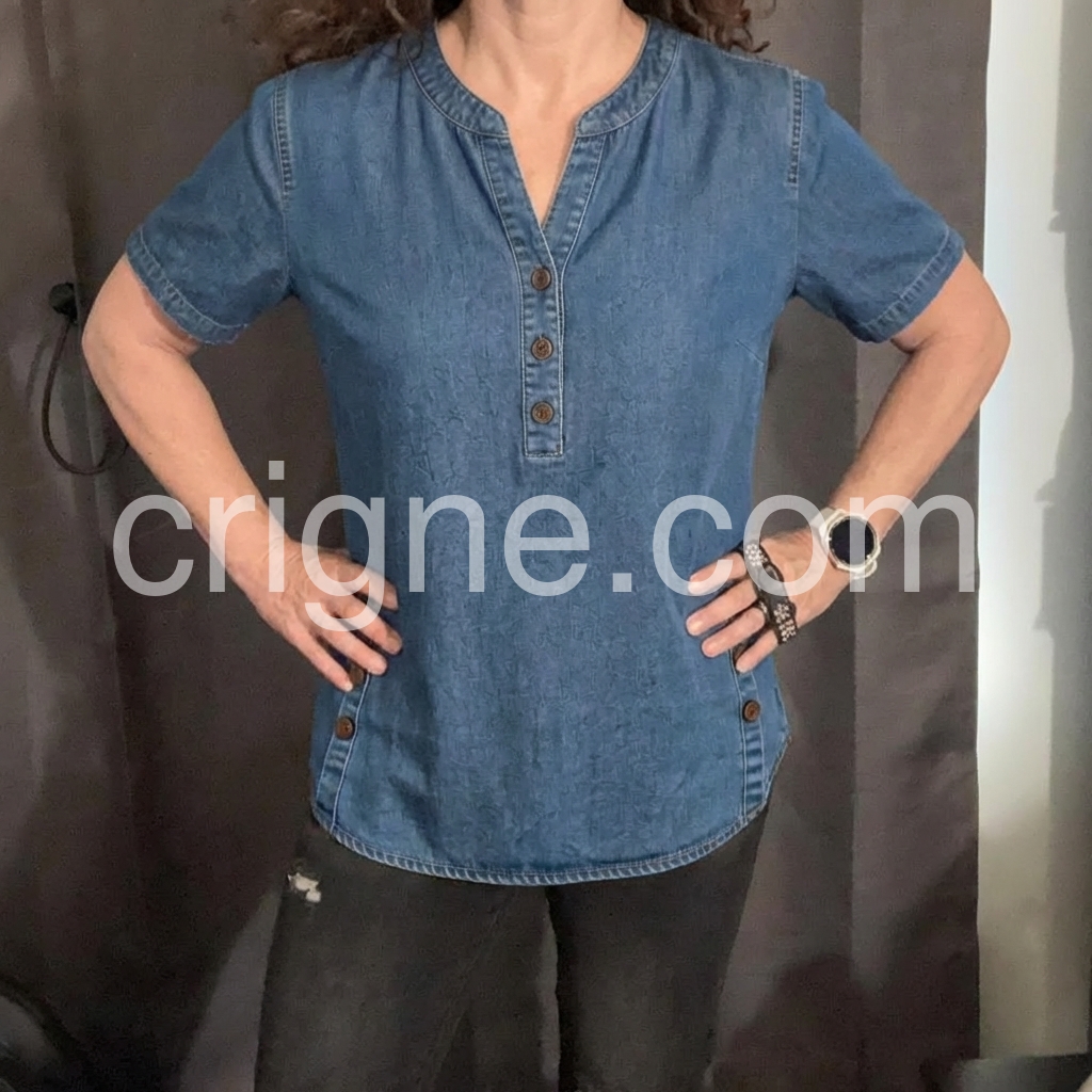 I absolutely love this top! It has the look of denim but is so much softer and more lightweight. The button details on the front and sides add a really cute touch. Fits perfectly and is super comfortable for everyday wear.