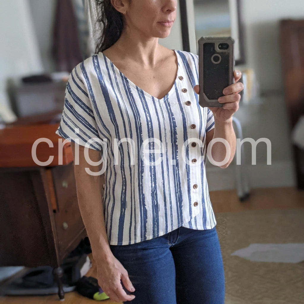 I absolutely love this top! The asymmetrical hem and the buttons down the side give it such a unique look. The vertical stripes are really flattering and it fits exactly as expected. Highly recommend for a casual but put-together outfit.