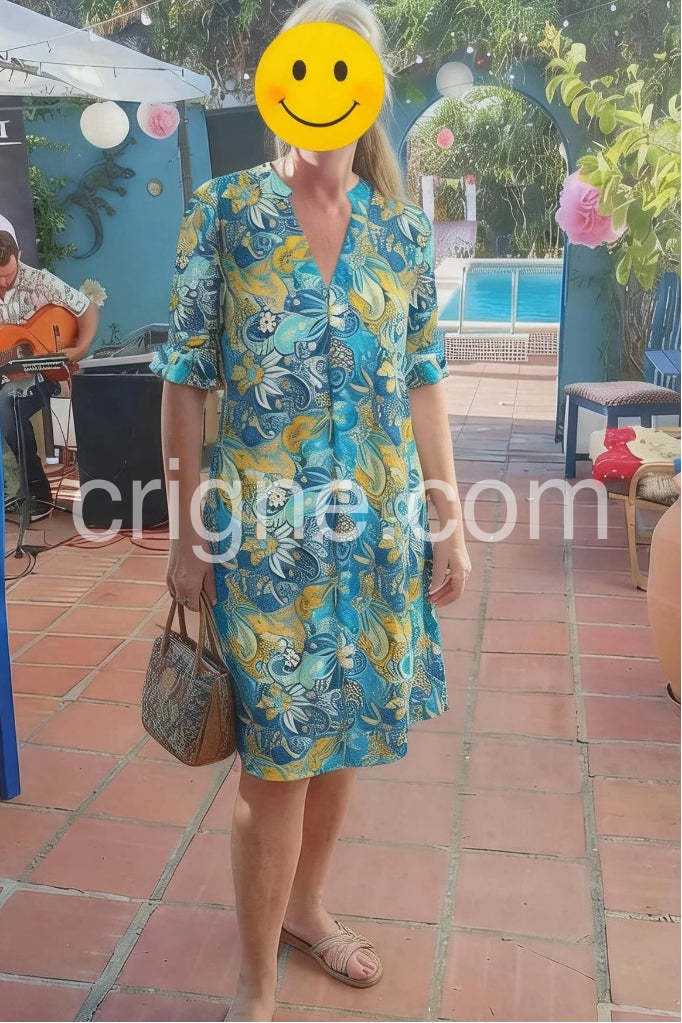 Love the bold floral pattern and the relaxed but feminine silhouette. The fabric drapes nicely, and the sleeve length is just right. Great for casual gatherings, brunches, or a seaside vacation. Would recommend to friends.