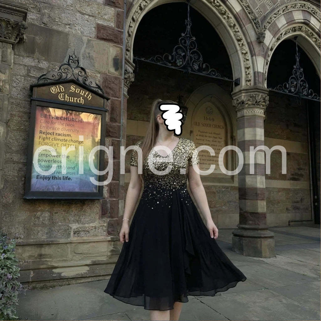 Beautiful dress for a holiday party! The sequins on the bodice catch the light perfectly without looking cheap. The skirt drapes beautifully and hides any tummy insecurities. I ordered my usual size and it fit like a glove. Will definitely buy from this brand again.