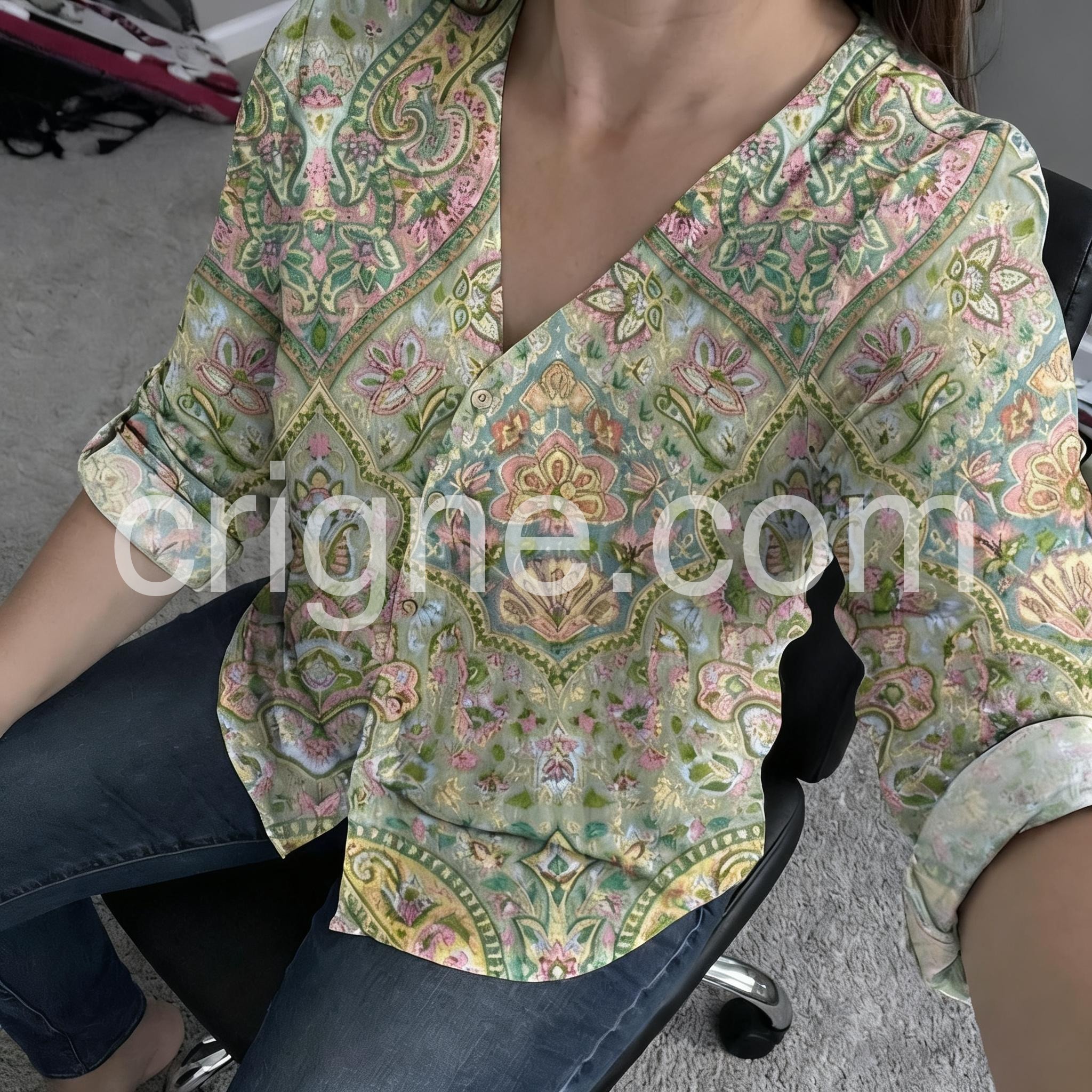 This blouse has a nice print on it and the fabric is soft and flowy. I ordered a size small as suggested on the size chart. It’s an okay casual or semi-casual blouse that can be paired with jeans or dressed pants.
