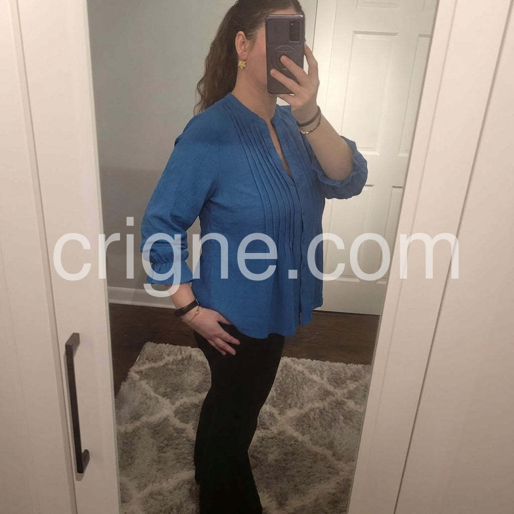 I absolutely love the color of this top! The blue is exactly as pictured and the fit is incredibly flattering. The pleats down the front give it a nice structure while still being flowy and comfortable. Fits true to size.