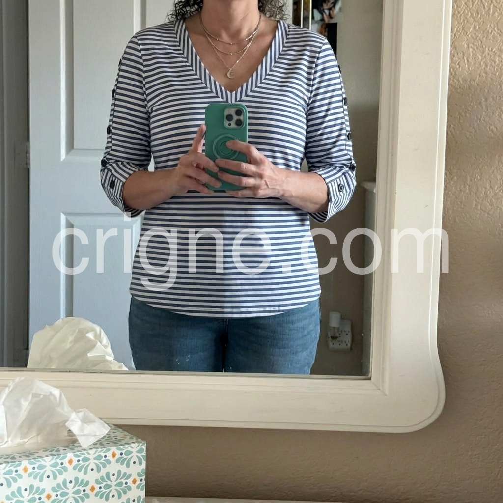 As a fashion editor, I love how this top reimagines the classic stripe with modern flair. The deep V-neck flatters every face shape, while the three-quarter sleeves with button accents solve the common issue of “boring basics” by adding subtle visual interest.