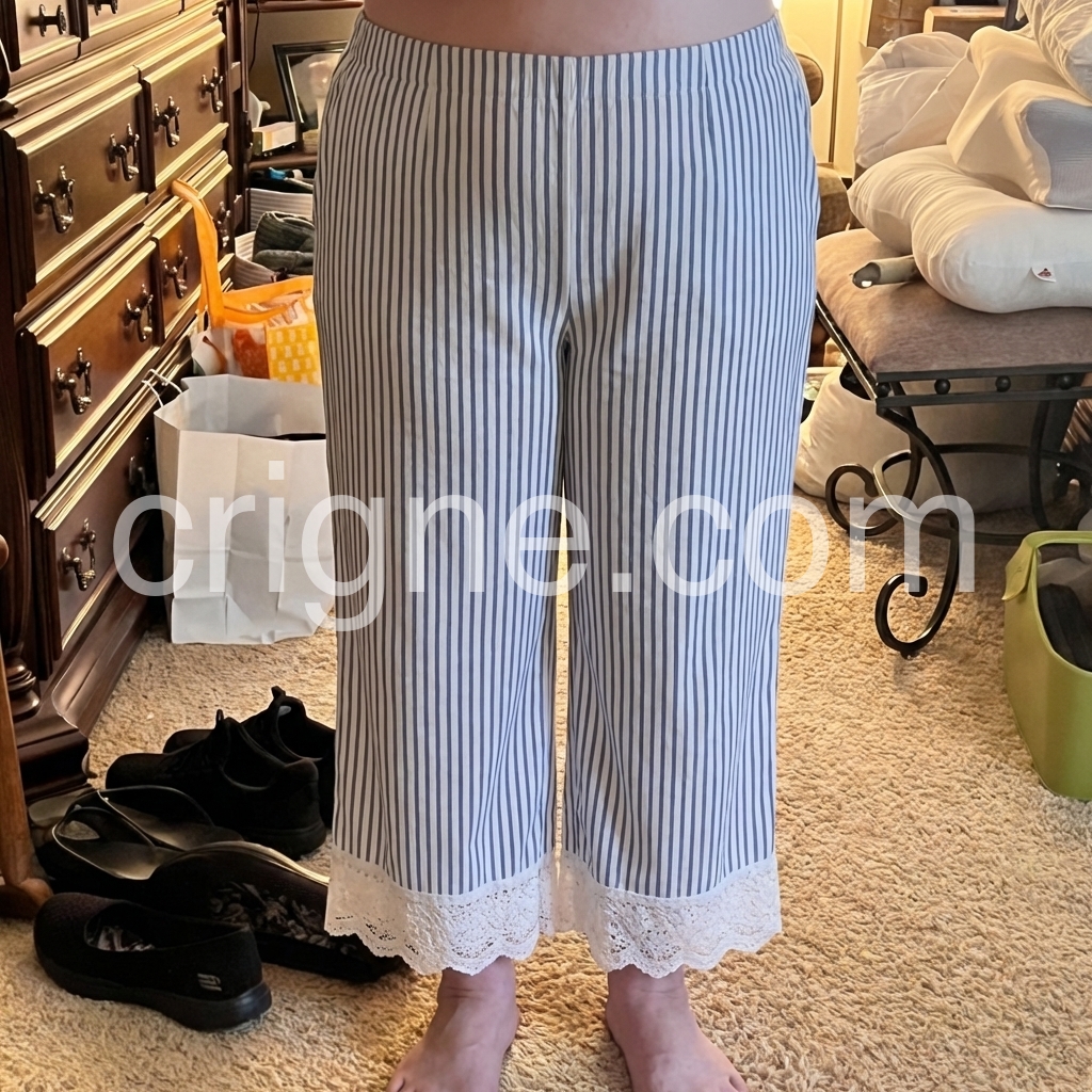 Such a unique and pretty piece. The combination of the classic blue and white stripes with the white lace hem is perfection. This dress is very comfortable for all-day wear.