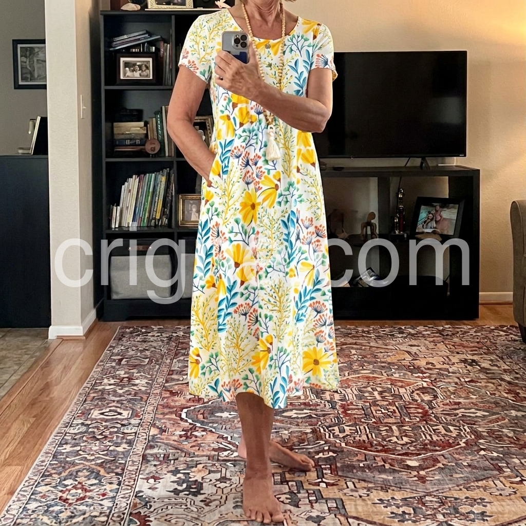 Bought this for my upcoming beach vacation and it did not disappoint. It does not wrinkle easily in the suitcase and is so comfortable for walking around all day. The yellow and blue flowers are so cheerful.