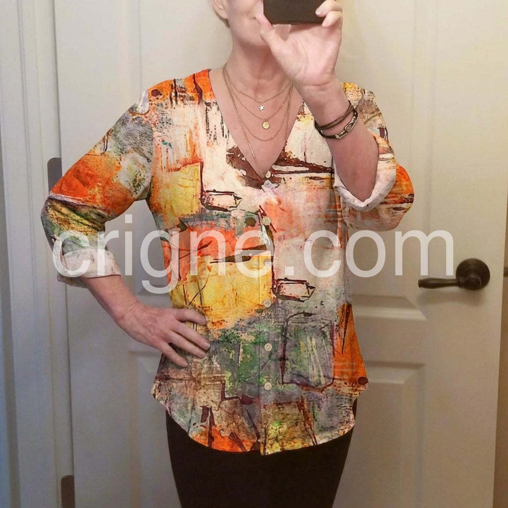 am obsessed with this watercolor print blouse! The blend of warm oranges, soft yellows, and subtle greens creates a stunning, artistic look that stands out without being overwhelming. The V-neck design is incredibly flattering. The fabric is lightweight, breathable, and has a lovely drape—no stiffness at all! It pairs seamlessly with jeans for a casual day out or dress pants for the office. The fit is true to size, and the small button detail adds a charming touch. I’ve already gotten multiple compliments and will definitely be buying more colors!