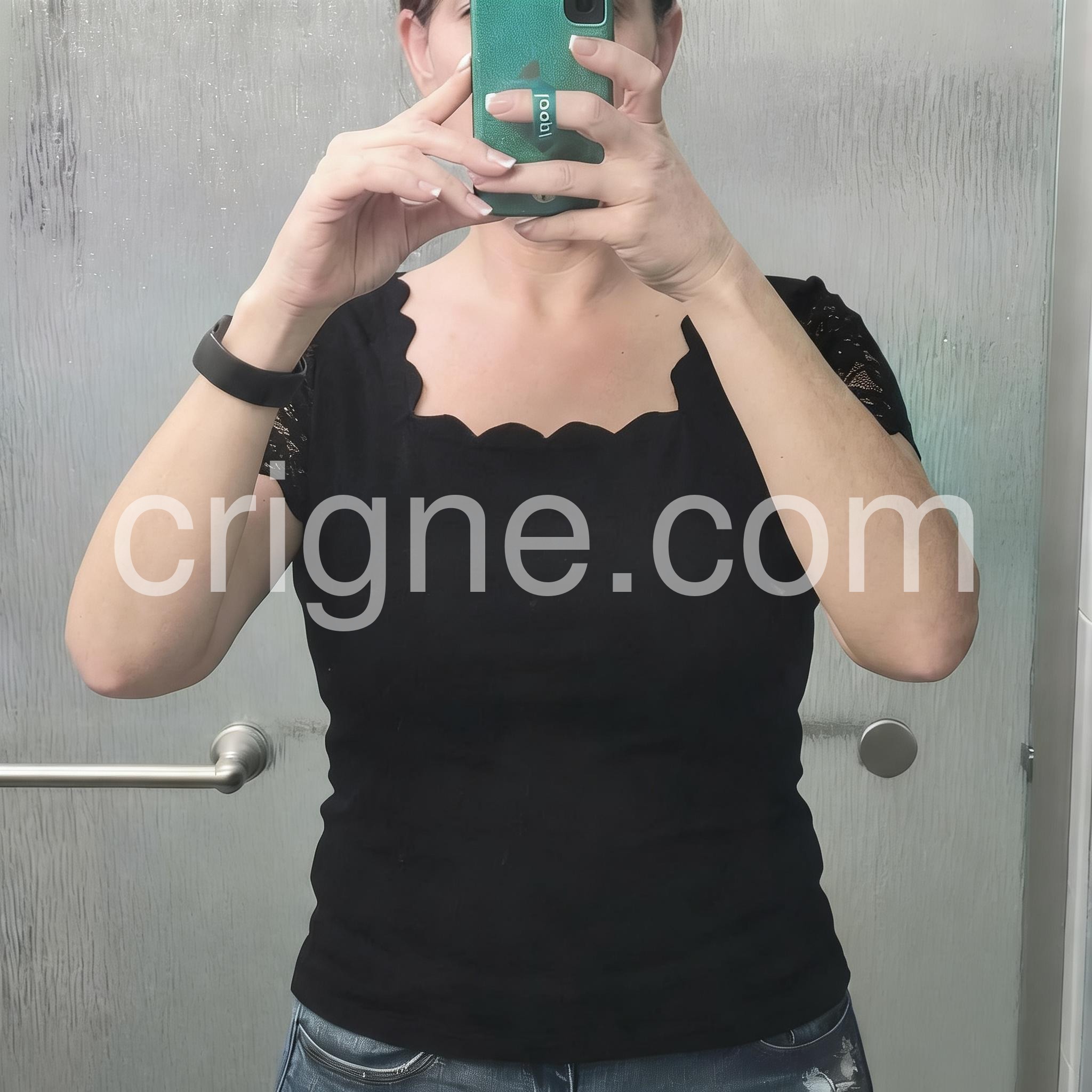 Cute top! Comfy & stretchy, but form fitting as well. I can wear med or large, but based on size chart & reviews I ordered a large and I'm glad I did. For reference I'm 5'7\", 34D, 152lbs. Since it is fitted, it will show curves, lumps, etc. Perfect basic, classy top, can dress up for work w/a blazer or wear solo with jeans for a more casual look.