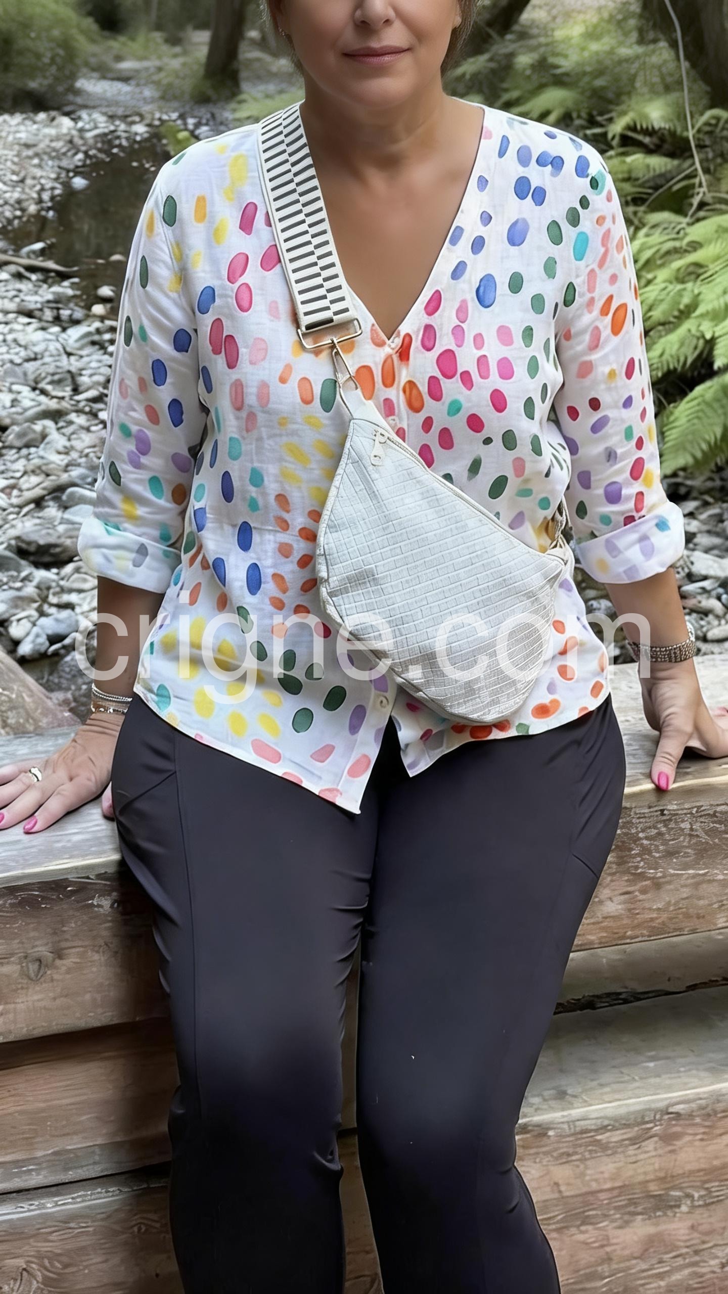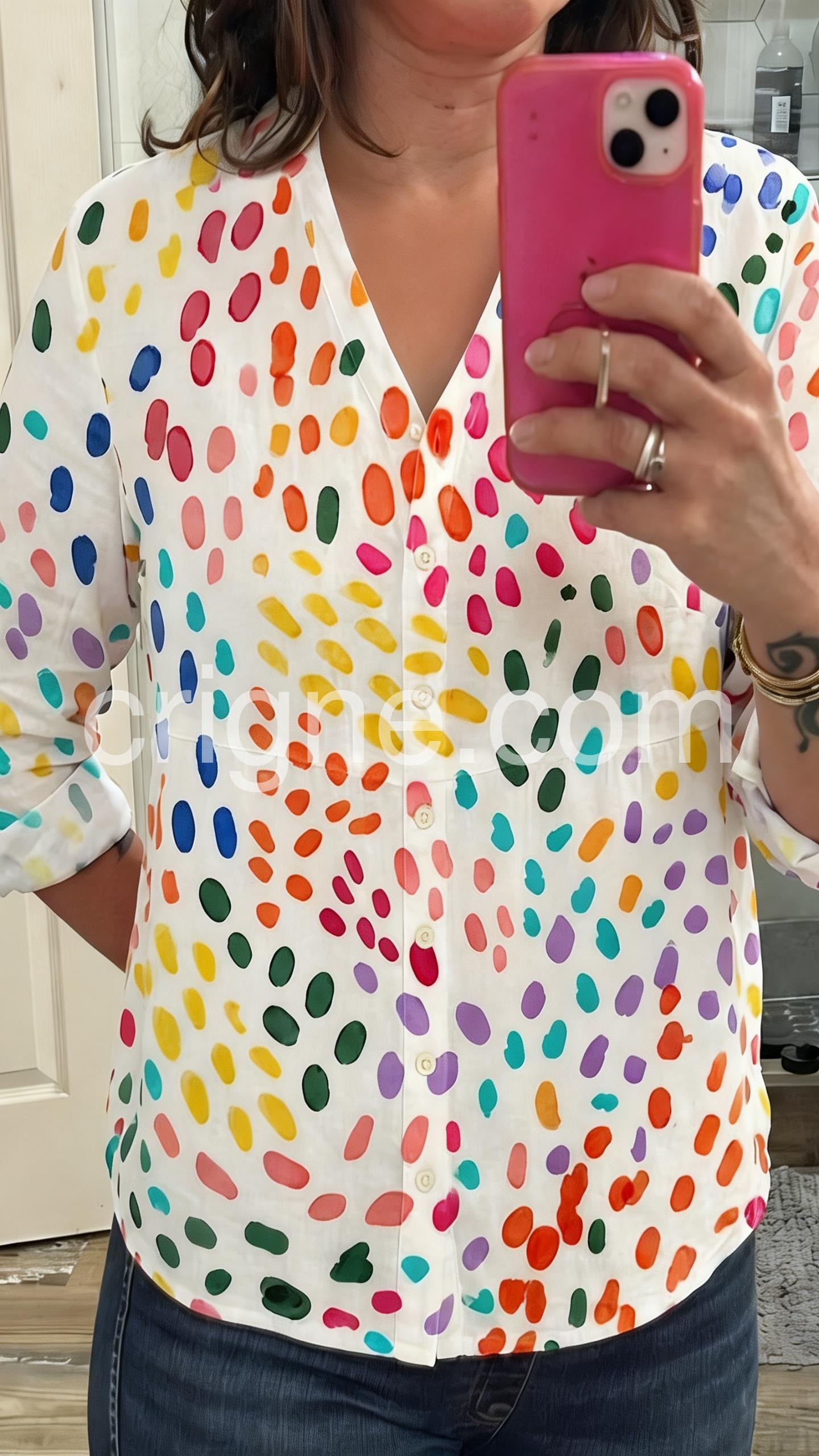 Such a fun blouse! I can dress it up for work or wear it with jeans like the model. The rainbow spots are vibrant but not overpowering. Highly recommend!